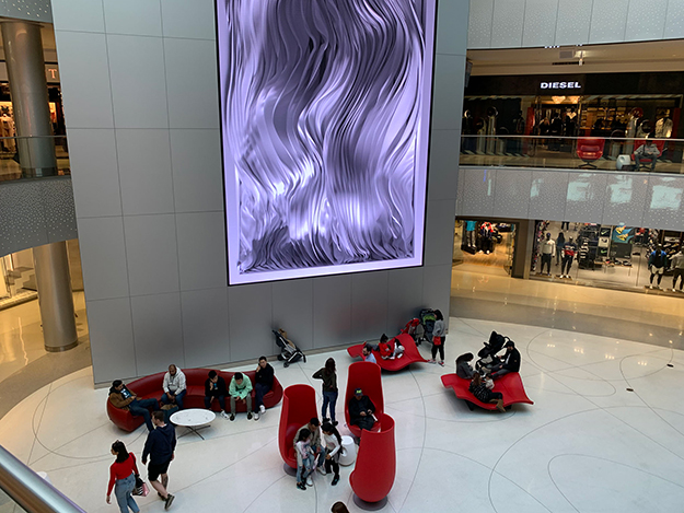 最近は空港やイベント会場等でも大型のデジタルサイネージを目にする機会が増えた。しかし、商業施設における、これだけの大きさのLEDパネルはアメリカ西海岸でも珍しいのではないだろうか。