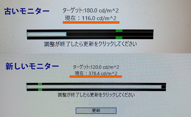 今回、後継機種の最新モデルを購入した。さらに、今まで使用していた液晶モニターをキャリブレートしてみたら、なんとモニターの明るさが全然足りていないことが判明した。液晶モニターの明るさを手動で最大にしてもソフトが求める明るさの3分の2にも満たない状況で、やはり古いモニターだったのでいつの間にか劣化していたのだが、以前のソフトではソフト側から明るさの基準値を求められることがなく、劣化で明るさの不足に気づかなかったのだ。