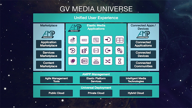 さらにGV AMPPをベースに、GV AMPPに対応する他社ソリューションをマーケットプレイスで追加可能な「GV Media Universe」を発表。映像も音声もグラフィックもクラウド上で一つのシステムにできるという。