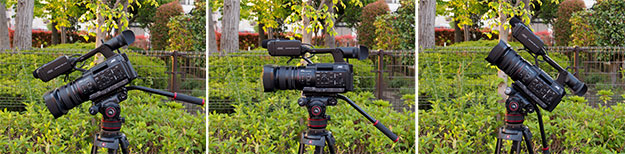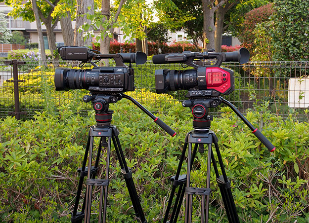(上)Sony PXW-X70(下)JVC GY-HC550。これだけ大きさの違うカメラが同じフィーリングで扱えるのは少人数ロケで助かる