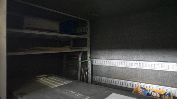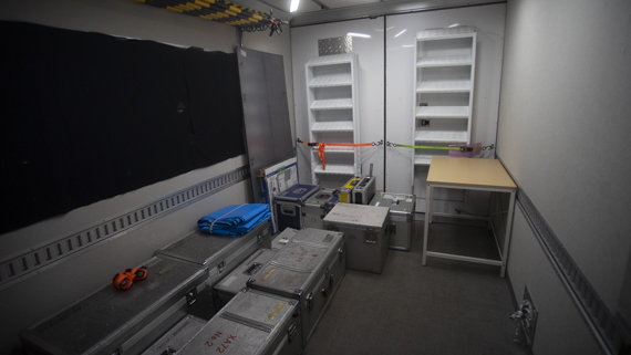 スタジオスペース。移動時は機材置き場で、現場に着いて荷物を下ろすと作業スペースにもなる