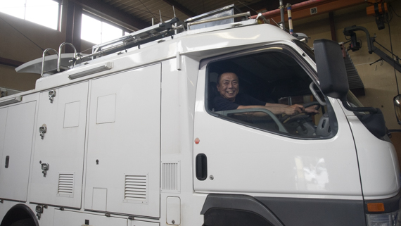 ただ、元々中継業務に関わっていたので、早い段階から自分のプロダクションにも中継車はほしいと思っていました。そこでVIVIDとして2001年に独立起業し、自分1人で同年7月に自社用中継車1号車を完成させました。1号車のベースは、某携帯電話会社が使っていた事務室車でした。発電機とエアコンがついている車体を中古で購入し、自分で設計施工してラックの固定から機材も詰めて、配線もすべて自分で行いました。松本の陸運局に持ち込んで構造変更して中継車登録もしました。