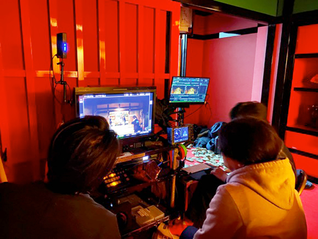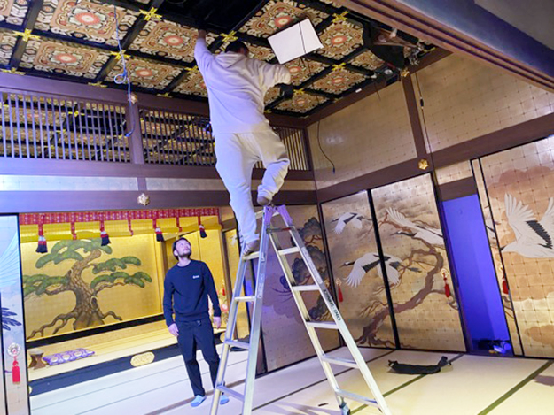 カメラの向きが縦横無尽に動くので照明をいかにみえない場所に仕込むかがカギ。金色を美しく出すためにも照明はとても大事だ