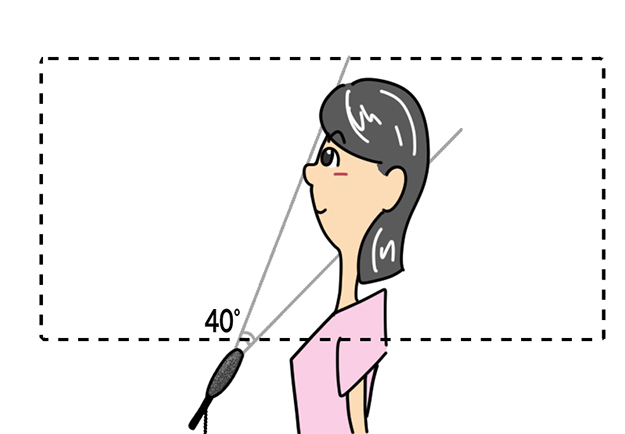 置きマイクで頭上からマイクを出すのは、相当長いマイクスタンドでないとできないので、現実的ではない。そこで置きマイクの場合には、被写体の下にマイクを設置して、マイク方向を上に向ける。