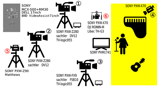 ピアノやスタビライザー(今回は3軸)は小型のPXW-Z90とPXW-X70でカバー。これで4カメだ。当初はこれだけでもOKだったが予算が許すなら上手を遊軍的に印象深い映像を挿すように新製品のFX9を提案。山本氏の同意も得たので下手PXW-Z280・センターPXW-Z280・上手FX9の3台をメインにスタビライザーと鍵盤用の合計5カメ。