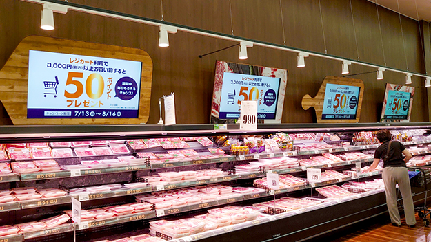 そのためメッセージは明確に伝わってくる。流通系のサイネージでこういったシンプルな使い方をしているところはほとんど見かけない。ディスプレイのベゼル部分は売り場の商材に合わせた商材で装飾されている。これによってさらにコンテンツがはっきり目に入ってくる。訪れたときは、スマートショッピングカートを利用して3,000円以上購入すると50ポイントが追加されるキャンペーン中だった。