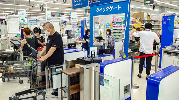 買い物が終わると、スマートカートの利用者はクイックゲートを利用することができる。Amazon Goとは異なり、店内にあるカメラでどの商品を購入したかという情報は取得していないと思われる。そのためクイックゲートは無人ではなく有人だ。ここでは係員がカートの中の商品を目視でざっくり確認している。決済はこの時点で行われる。性善説に基づいているようだがはっきりとしたことはわからない。