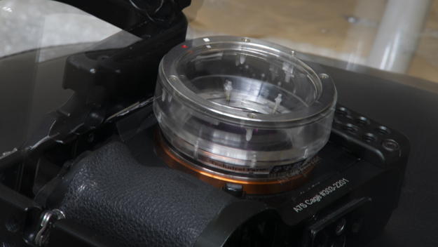 フレアが入るのが面白いことだとわかって、弊社でもレンズを加工することにしました。当初、EFレンズの前部をアクリルにしようと考えましたが、それではそのレンズしか使えません。EFレンズのフランジバックは44mm、Eマウントのフランジバックは19mm。そこでその差を透明にして、いろんなレンズが使えるアダプターを作ることにしました。