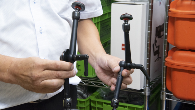 弊社はイルラエル製のNOGAフレキシブルアームの正規代理店になって約10年になります。現場のモニターを支えているのは、ほとんどNOGAのアームです。実はオリジナルは、締めすぎると壊れやすい。そこで、「もっとロックの強いものを」という要望に応えた、NOGAアームのTF-Versionをつくりました。連結部分の面積を大きく広くしまして、ガッチリと支えられるようにしています。固定ロックがよりパワーアップしているので、さらにモニターなどを支えやすくなっています。