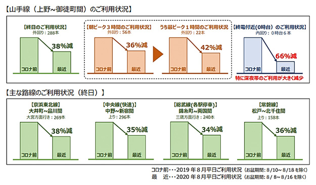 昨年と比較してこの8月の利用状況は、山手線の場合、終日で38%減、朝のピーク時間帯は36%減、最も乗客が多い時間帯で42%減、終電付近は66%減という大幅な減少となっている。この傾向は山手線に限ったことではない。さらにデータこそ公開されていないが、私鉄や地下鉄の状況を見ても、この傾向は変わらないだろうと容易に想像できる。