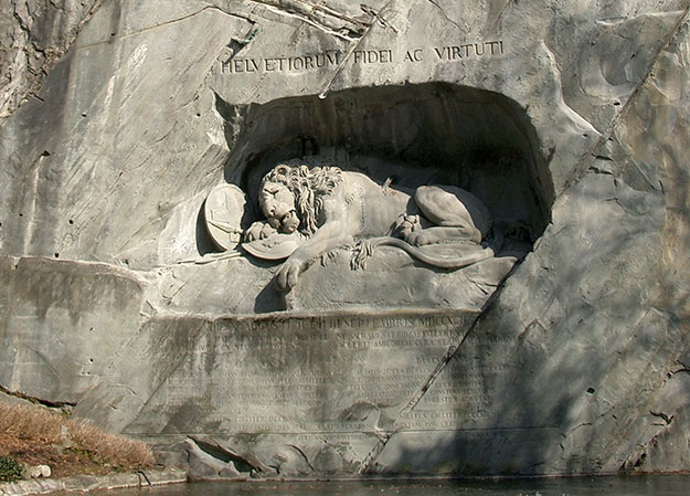 そして、1821年。フランス革命でフランス王家のために戦って死んだスイス人の兵士の忠誠心と武勇を称え、デンマークの彫刻家ベルテル・トーヴァルセンにより「嘆きのライオン像」が制作された。スイス傭兵を象徴するライオンの背中には折れた槍が突き刺さり、斃れたライオンはなおもフランス王家の紋章が描かれた楯を守り続けている。像の上部にはラテン語で「Helvetiorum fedei ac Virtuti(スイス人の忠誠心と勇気に)」と彫られており、スイス傭兵への敬意が著されている。