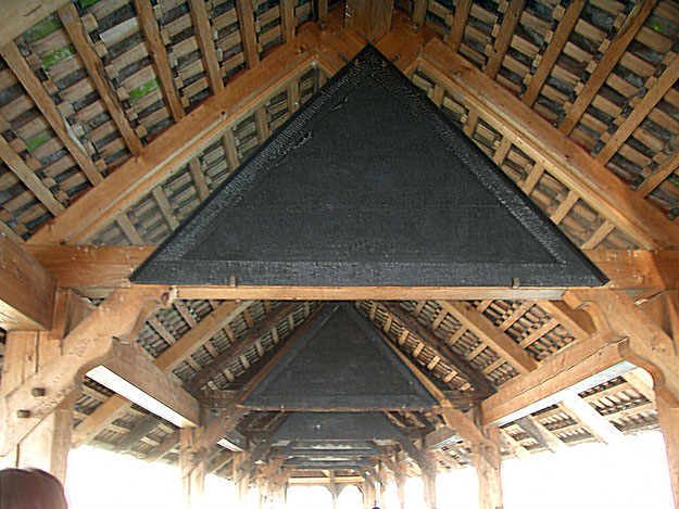 さて、ルツェルン観光の最初の到着地点は、その「ライオン像」だったのだが、続いて訪れたのが、やはり「カペル橋」である。14世紀から架けられているこの橋は、1993年8月に火災に見舞われ、橋の大部分が焼け落ちるという悲劇に見舞われる。1994年には再建されるが、屋根の梁に描かれていた守護聖人伝記などの絵画も大半が消失しており、現在は炭化して黒くなったオリジナルの絵画が一部飾られている。