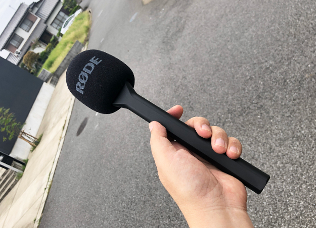 さて、SM63やMKE600を使えばベターだが、Wireless GOをショットガンマイクやインタビューマイクの代わりに使うこともできる。純正部品として、Wireless GOをインタビューマイクにするグリップInterview GOがある。Wireless GOを先端に付けて使うグリップだ。ウインドシールド(スポンジ)が付属しており、Wireless GOがインタビューマイクに早変わりする。