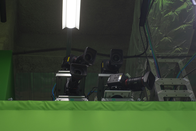 グリーンを張り詰めた20.15×14.73mの空間に、4K60p収録が可能なシネカメラが100台以上囲んでいる。その中の8×8m、高さ3.5mがキャプチャエリアだ。バスケットボールコートの中にバレーボールコート半面分の収録領域があるとイメージしてほしい。そのエリア内なら様々なパフォーマンスを丸ごと収録でき、それを無限の空間に配置して縦横無尽なカメラワークをつけることができる。3次元の立体に時間軸も自由に出来るわけで、使い古された表現だけど、まさしく4次元の映像体験だ。