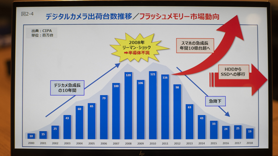 まず、デジタルカメラ用メモリーカードの需要減少です。私の現職はプログレードデジタル日本代表ですが、それ以前はサンディスクとマイクロンで約14年間、メモリーカードビジネスに従事しました。業界の過去を振り返ると、フラッシュメモリー業界はメモリーカードとUSBを主要な用途としていましたが2010年を境に行き詰まりを見せ、スマートフォン市場が急成長を遂げました。例えば、2010年のカメラの出荷台数はコンパクトカメラも含めて1億2,000万台でしたが、スマートフォンはその数年後には年間10億台を超えました。