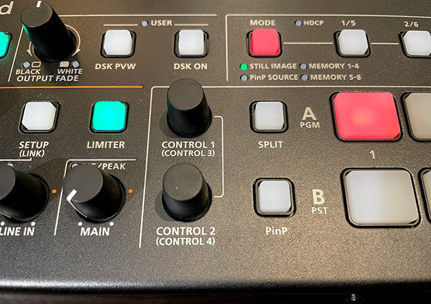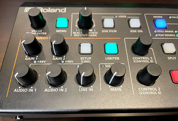 V-1HD+はローランドの製品だけあって、オーディオミキサーの機能が充実しています。例えば、バラエティーのような配信だと笑い声の音が割れてしまうことがありますが、本体のトップパネルにあるボタン“LIMITER”を活用するとこうしたトラブルも回避できます。“LIMITER”のオン・オフをワンボタンで操作でき、いまオンかオフなのかも一目で確認できます。