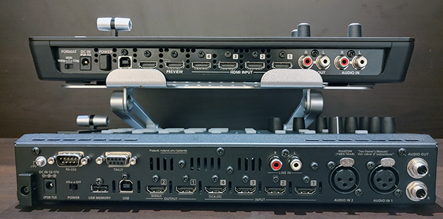 V-1HD+本体の縦、横の大きさはV-1HDとほぼ同じです。タリー出力用のTALLY端子や外部制御用のRS-232C端子、そして、XLRの音声入力/TRS標準の音声出力端子がリアパネルへ搭載されたこともあり、V-1HDと比べればV-1HD+本体の厚さは少し増しました。