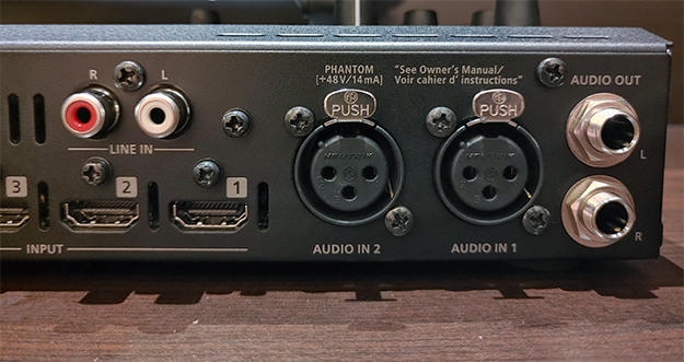 V-1HD+では「XLRタイプの音声入力、TRS標準タイプの音声出力端子が備わり、業務用音響機器とバランス接続が可能となった」ことは大きなトピックと言えます。