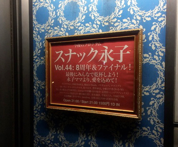 「スナック永子」とは、MV専門ライターとして勝手に活動していた当方が、2005~13年まで開催していた不定期イベントである。会場は、惜しまれつつも閉店した西麻布スーパーデラックス。音楽や演劇、アートイベント等で知られていたハイブリッドなスペースにて、映像を中心としたクリエイターが夜な夜な集い、スクリーニングやパフォーマンスを行う。そして、有志の女性陣がドレスアップをして出迎える。それが、大雑把にいえば我らがスナックのあらましである。