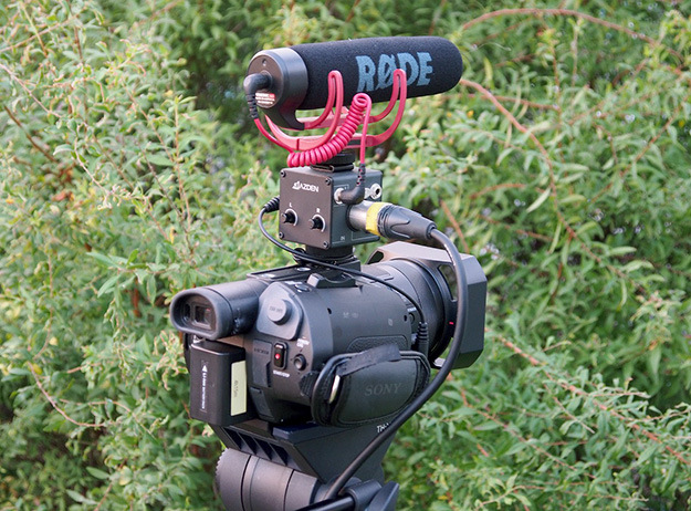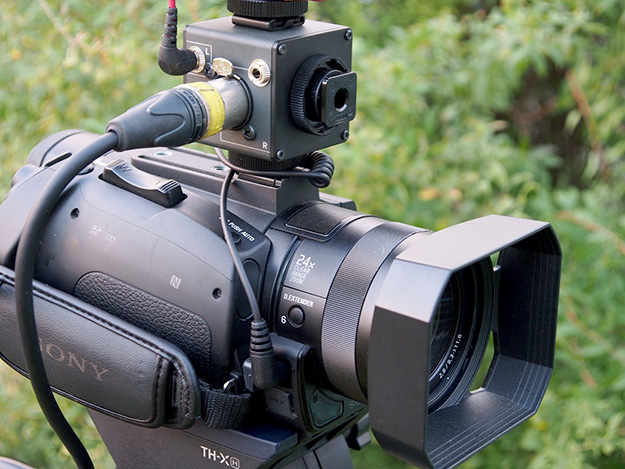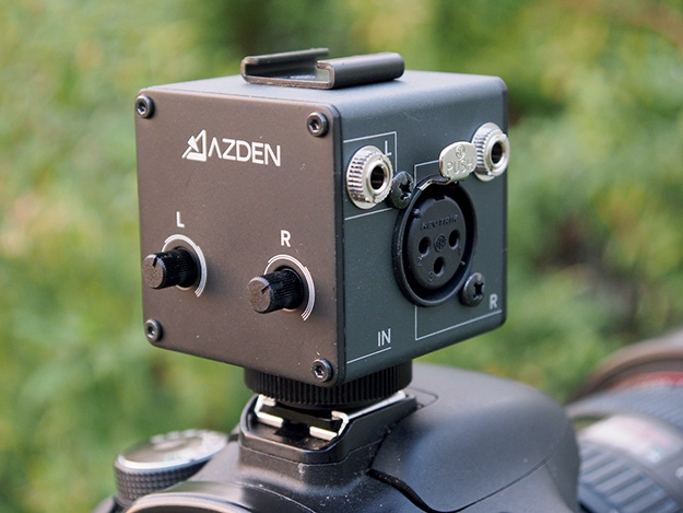 AZDENと言えばワイヤレス、特にB帯での低価格デュアル受信機を最初に作ったメーカーだ。この小さい箱型ガジェットMC-1を紹介しよう。これは簡易的に音声をミックスするインターフェースと言えばわかりやすい。業務用音声入力は、基本はキャノン入力がデフォルトだ。ビデオカメラでもENGやハンドヘルドではキャノン端子にミキサーやワイヤレス機器からの入力になる。キャノン入力が付いていないビデオカメラなどは民生機扱いで業務使用することはなかった。