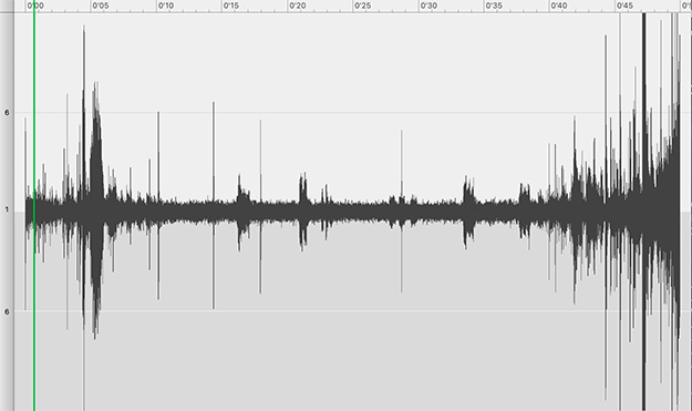 しかし、これはそう見えるだけで、最終納品の24bit(もしくは16bit)リニアに収まるように、ゲイン調整をすれば大丈夫だ。この辺りは、通常の整音作業と全く同じである。F2で収録した自然の音の波形データを掲載しておく。
