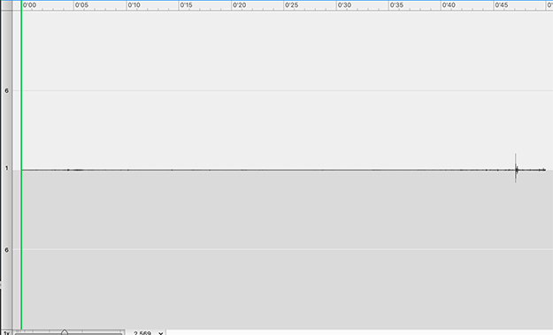 補正前は音がないような波形だが、+48dBにゲインアップすると、波形が現れる。この状態でもホワイトノイズはなく、飛び出しているのは鳥の声で、下の方は工場地帯の雑踏である