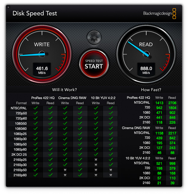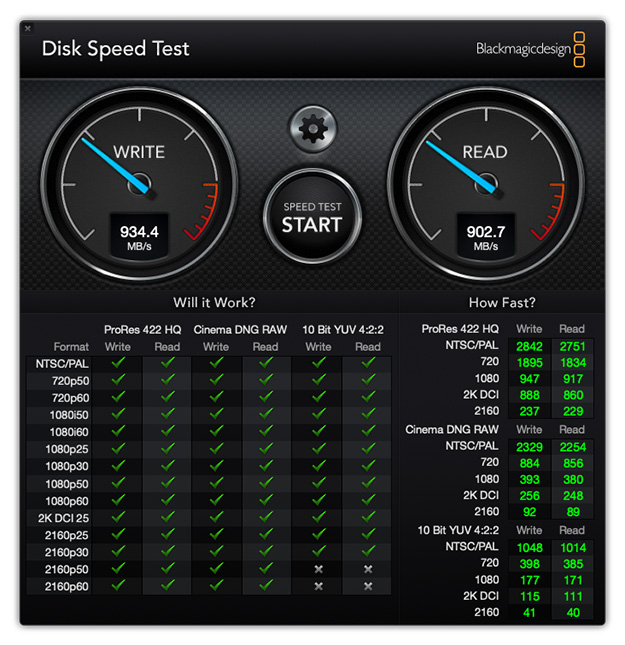 - Blackmagic Disk Speed Testによる読み書き速度の測定(特に書込み速度の安定性を重視)