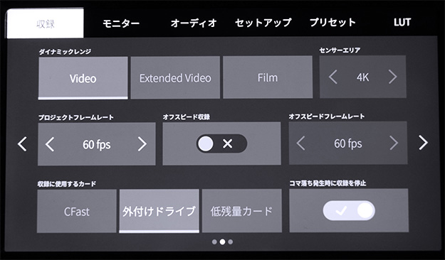 ケーブルで両者を接続し、BMPCC4Kの電源を入れればサンディスク エクストリーム プロ ポータブルSSDは自動的に認識される。メニュー画面から[収録タブ]を開いて[収録に使用するカード]の項目に「外付けドライブ」として現れる。フォーマット画面を呼び出せば、残量や記録可能時間を確認できる。