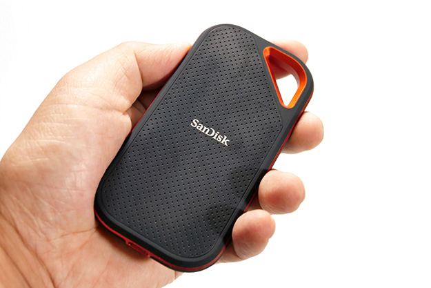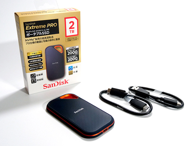 今回、デザインは変わらないが、前モデルより速度が約2倍高速化した「サンディスク エクストリーム プロ ポータブルSSD」をお借りして、撮影現場や編集プロセスでの使い勝手を検証してみた。