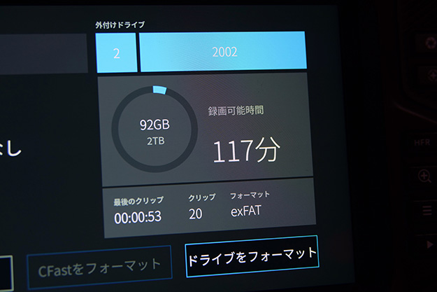 なお、Blackmagic RAW固定ビットレート3:1の4K DCI 60fpsの記録形式でサンディスク エクストリーム プロ ポータブルSSDの2TBを利用すると、約123分の収録が行えた。2TBで2時間、1TBで1時間と覚えておくと分かりやすい。