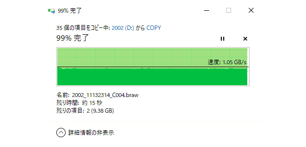 コピー時の転送速度は、平均1000MB/秒(1GB/秒)。約2TBのファイルをコピーするのに30分で完了した。ベンチマーク程の速度は出なかったが、これはコピーに使ったエクスプローラの性能などが関係しているかもしれない。高速コピー対応のユーティリティーソフトを使うなどすれば、実効速度は向上する可能性がある。