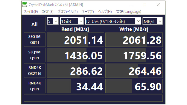 まずは、定番のベンチマークツールCrystalDiskMarkを使ってサンディスク エクストリーム プロ ポータブルSSDの転送速度を測定する。結果は読出し約2050MB/秒・書込み約2060MB/秒という期待以上の性能を確認できた。