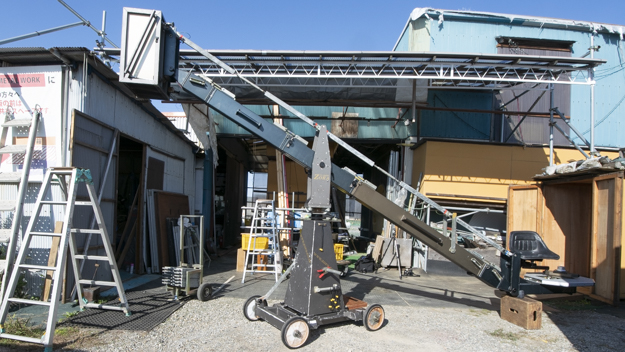 METAL WORKでレンタル取り扱いのエクステンション式リモートヘッド用クレーン。分割できるので、オフィス内の撮影も可能。レールもMETAL WORK自社製品で、耐荷重3,000kgの「プロフェッサートラック」