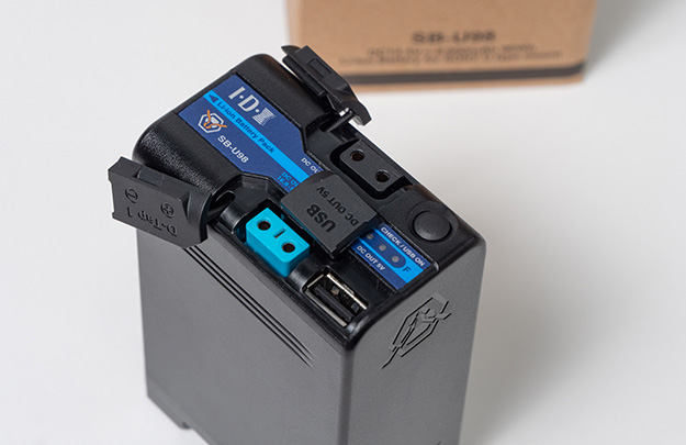 スライダーやステディカムなどで運用する際は、ワイヤレストランスミッターやフォーカスコントローラーなどのアクセサリー装着は必須。Vマウントバッテリーを装着した状態では、システム重量が増大して運用に支障が出てしまうが、SB-U98であればカメラへの電源供給と同時に、2口のD-Tapで外部機器に給電すると、Vバッテリープレートなどを用いなくても、必要な機器にまとめて電源供給できるのだ。USBの5Vで駆動できる周辺機器であれば、同様にバッテリーのUSBポートから給電可能。最近ではカメラや周辺機器のセットアップにスマートフォンを使うケースもあり、USB給電も現場では重宝する事この上ない。