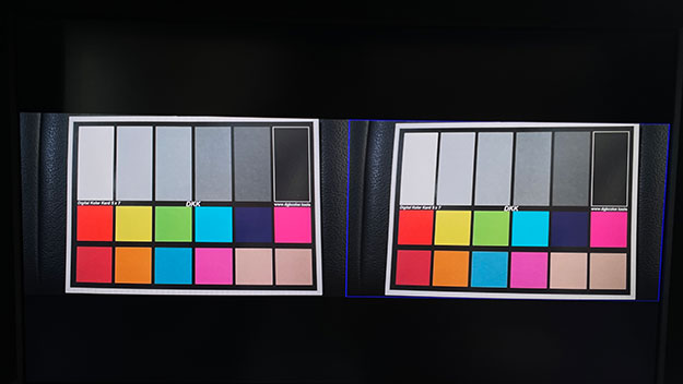 1つ目はカメラの色合わせ。3つのカメラの入力をHDMI1/HDMI2/DisplayPort(HDMIを変換)それぞれに入れ、基本になる入力を左側に表示し、他の2入力を右側で表示してカメラの色設定を操作し色を合わせていく。普通のモニターでも可能なことだが、カラーマネジメントモニターは忠実な色が出ているので色も合わせやすかった。変な黒つぶれなどもないので暗部も見やすい。
