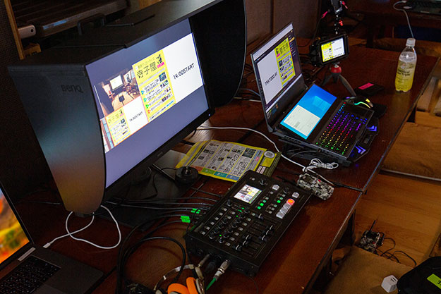 自分たちの機材でやる場合、モニターは普段編集に使っているモニターを持ち出す。正直なところ、持ち出して壊れるのが嫌なので安価なモニターを持ち出しがちだ。低価格帯のモニターは色味・視野角・解像度・色の再現度が微妙だがそれでよしとすることが多い。