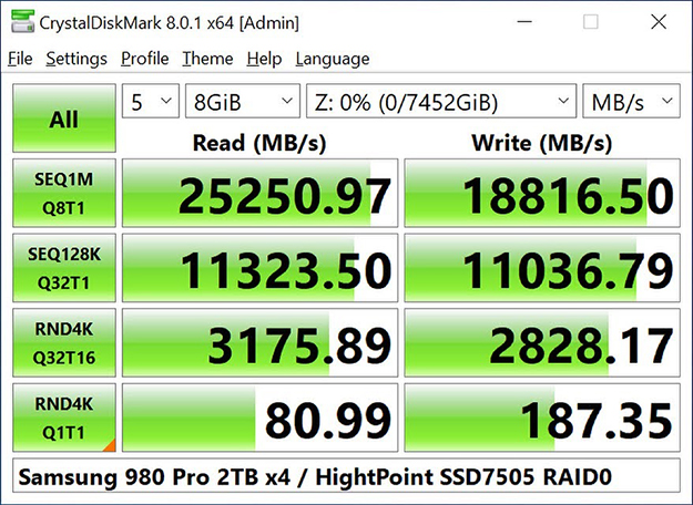 1つ目は、ストレージの処理速度が速いことです。ベンチマークソフトのCrystalDiskMarkでスピードテストをしたところ、読込速度が25GB/sと、私の人生の中で一番速い数値が出ました。純粋に撮影素材のコピーが速いです。