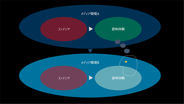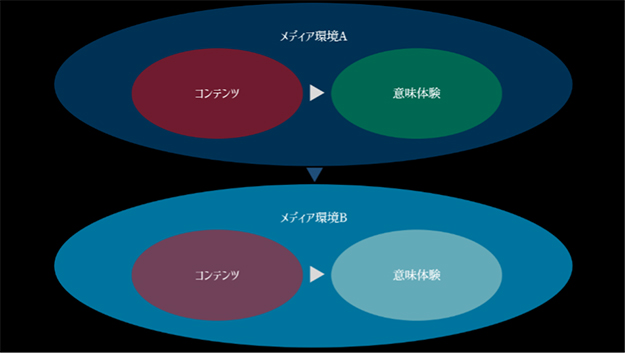 コンテンツ以上にメディアが意味体験を左右する。メディア環境Aがメディア環境Bへ変化すれば、コンテンツが同じでも(厳密には同じであるはずはないのだが)意味体験は変わってくる