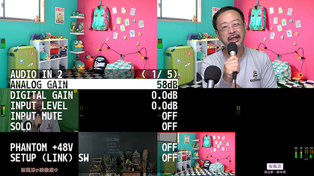 さて、実際の調整だが、黄色がいつも見えている程度に合わせる(ネット配信向け)。ちなみに、色分けは、-12dB以下が緑、-12dB~-3dBが黄色、それ以上が赤で表示される。これはほぼ業界標準なので、カメラやミキサーでも同じ色分けだ。