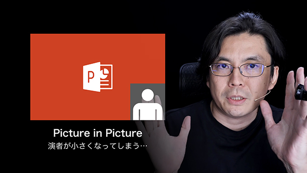 オンラインセミナーやイベント配信で多くみられる「ピクチャー・イン・ピクチャー」。 多くのビデオミキサーに実装されている便利な機能ですが、画面全体に表示したスライドの上にカメラで捉えた人物を小窓で配置すると「スライドが大きく、人物が小さい」構図になってしまいます。主役は人物、スライドはあくまで補助資料という関係において、その立場が逆転してしまうのは大きなデメリットです。
