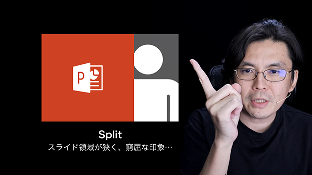 次に、画面を分割する「スプリット」。スライドを4:3の画角で配置し、空いたスペースに人物を配置するこの方式は人物のサイズは大きくなるものの、逆にスライドの領域が狭くなることで「画面全体が窮屈な印象」に見えてしまうこともあります。
