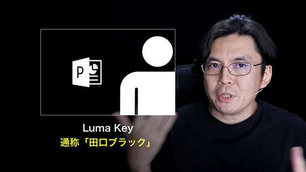 人物とスライド、互いの相乗効果を目指して、私が実践しているのが「ルーマキー(ルマキー)合成」です。「黒い背景+人物」のカメラ映像の上に「黒い背景のスライド」を透過合成するこの方式は、ライブ配信業界の一部で「田口ブラック」と呼ばれています。