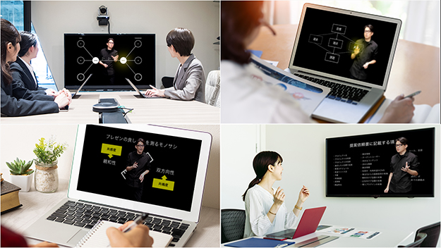 また、画面全体で人物の動き(ジェスチャーやハンドアクション)を表現できるので、スライドのアニメーションと連動したダイナミックな印象を与えることができます。