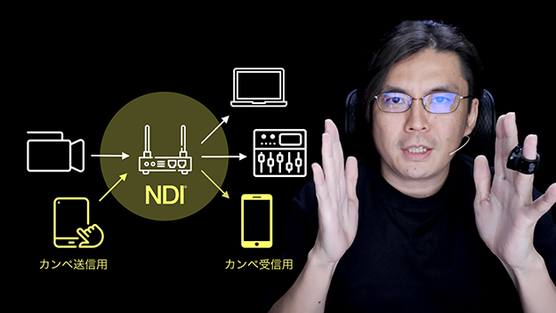 これまでカメラやビデオミキサーなどのルーティング(結線)は、HDMIやSDIなどのケーブルで機器のインプットとアウトプットを繋ぐ方式が一般的でした。今回取り上げるNDIは、ネットワーク経由で映像を音声を伝送する方式です。家庭や企業のローカルネットワークに映像信号や音声信号を送信し、そのソースを別端末で任意に受信できます。