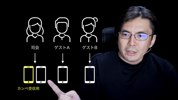 出演者との事前打ち合わせで「何かあった時は、このタブレットに指示を送りますね」と伝えておけば、突発的な対応であっても現場がバタバタせず、スムーズな進行を実現できます。また、「特定の出演者のみに、特定の指示を送る」といったカンペ出しができる点も魅力です。