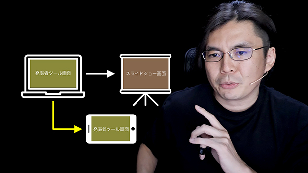 発表者ツールには、台詞原稿や次頁のスライドといった「プレゼン中に登壇者が確認したい情報」を表示しますが、登壇者の目線が手元のPC画面に向くと、頭が下がったり、カメラ目線から外れてしまうことがあります。
