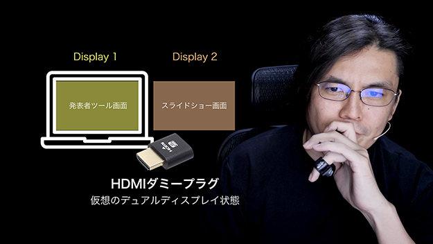 ちなみに、スライドショー画面と発表者ツールをそれぞれNDIで送出するためには、PCがデュアルディスプレイ状態になる必要がありますが、「PCにモニターを繋ぎたくない」「ワイヤレスで運用したい」という場合は、ちょっとコツが必要で、PCの外部モニター出力端子に「ダミープラグ」を挿すことで、デュアルディスプレイ状態を仮想的に用意できます。