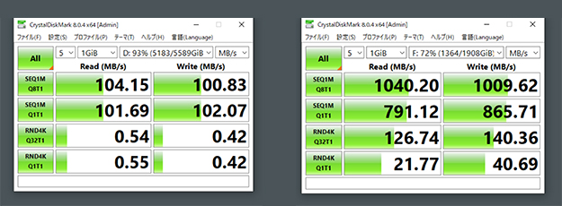実際ストレージの速度を計測してみたところ、普段使用されているHDD(シングル運用)が読み書き100MB/秒に対しG-DRIVE ArmorLock SSDはスペック通り1000MB/秒を超え、数値としても10倍の速度が出ていた。