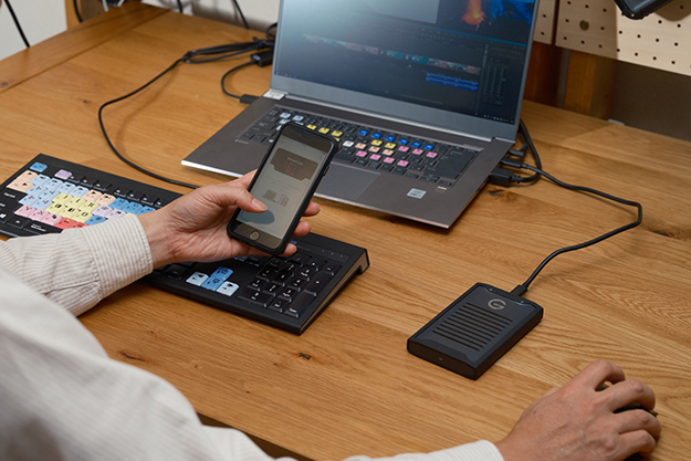 今回江夏さんに試してもらったアイテムはSanDisk Professionalの「G-DRIVE ArmorLock SSD」。G-DRIVE ArmorLock SSDはUSB 3.2Gen2接続のポータブルSSDで、読み書き最大1000MB/秒の転送速度を持つ。そして最大3mからの落下保護、1000ポンド(約450kg)の衝撃耐性、IP67の防塵・防水性を備えている。さらにスマートフォンを使ってパスワード無しでの施錠・解錠が遠隔でき、そのアクセス権も管理できる画期的なSSDだ。