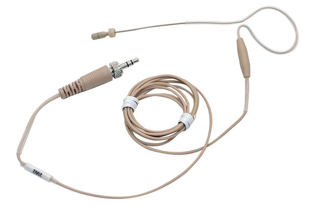 このマイクは、通常は耳に掛けて口元へ伸ばすヘッドセット式だが、柄が針金式になっており、付属のクリップで胸元にセットすることも可能だ。ただ、舞台用のマイクなので大声対策になっていて、若干だが感度が低い。通常のプラグインパワー出力があるカメラであれば接続できるはず(プラグインパワーには相性があるので、保証はできないが)。
